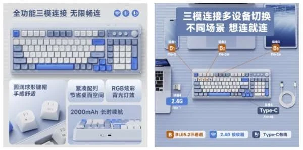 Клавиатура K01 обладает трехрежимной системой подключения, что делает ее универсальной и подходящей для пользователей, которые работают на разных устройствах. Она поддерживает Bluetooth, беспроводное соединение 2,4 ГГц и проводное подключение через USB-C. Благодаря этой универсальности, она идеально подходит для тех, кто использует несколько устройств, таких как ноутбуки, настольные компьютеры и планшеты.
