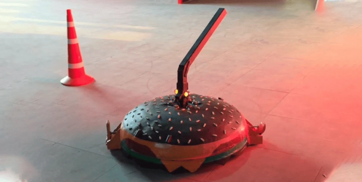Форма робота играет ключевую роль. Круглый корпус выполняет функцию активного механизма: визуально он напоминает массивный диск, а во время движения похож на бургер, который раскручивается прямо на арене. Дополнительная система защиты позволяет роботу сохранять устойчивость и способность атаковать даже тогда, когда он оказывается в нестандартных положениях.