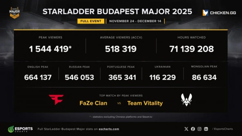 Несмотря на высокие цифры, турнир в Будапеште немного уступил предыдущему мейджору сезона. Июньский BLAST.tv Austin Major 2025 привлек 1,78 млн зрителей в пике и суммарно набрал 76 млн часов просмотра.
