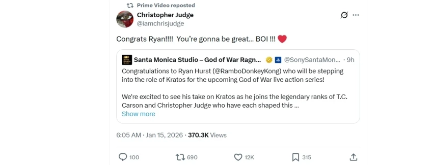 Актёра уже поздравили Santa Monica Studio и его коллега Кристофер Джадж, исполнитель роли Кратоса в God of War (2018) и God of War: Ragnarok.