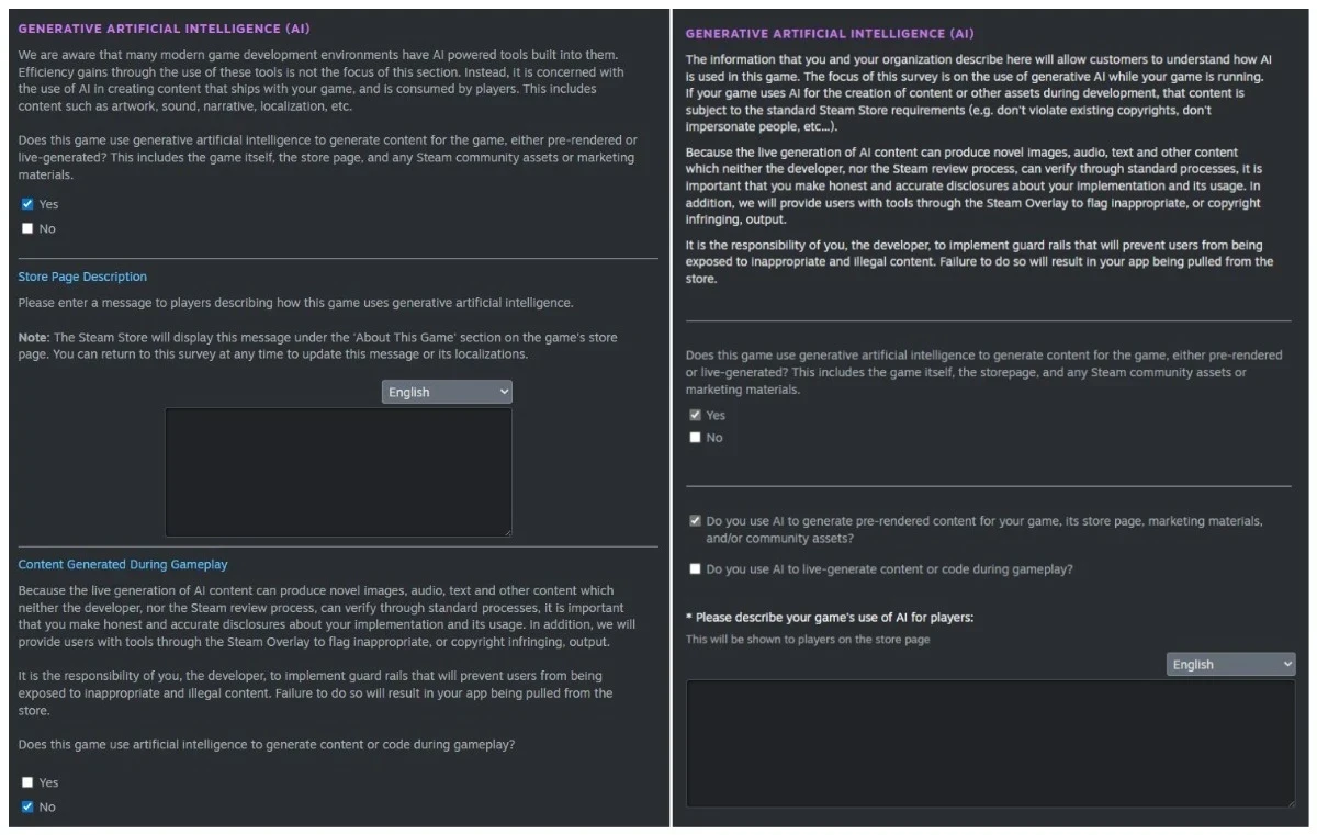 При этом обязательства по прозрачности никуда не делись, но теперь они касаются только того, что реально влияет на финальный продукт. Разработчики по-прежнему должны указывать, если ИИ применялся для создания контента, попавшего в игру, на страницу в магазине или в маркетинговые материалы. Для этого в форме предусмотрено отдельное текстовое поле, где студия описывает, как именно использовались генеративные технологии.