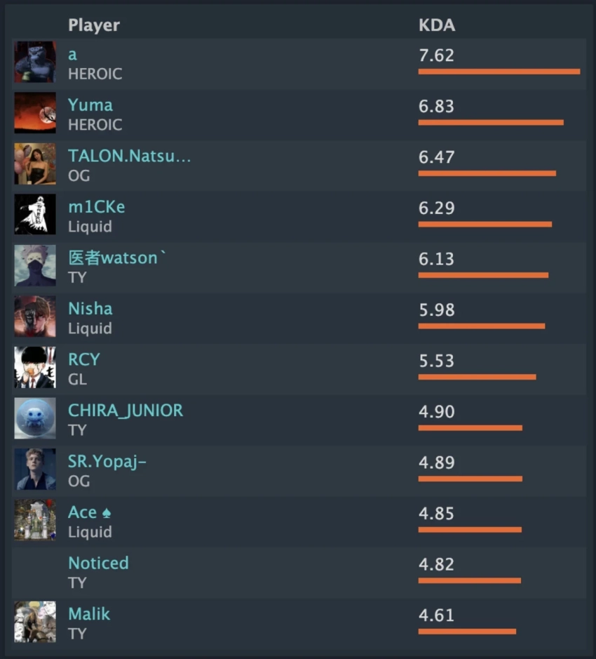 • Между ними вклинился керри Team Yandex Алимжан «watson» Исламбеков с KDA 6.13.